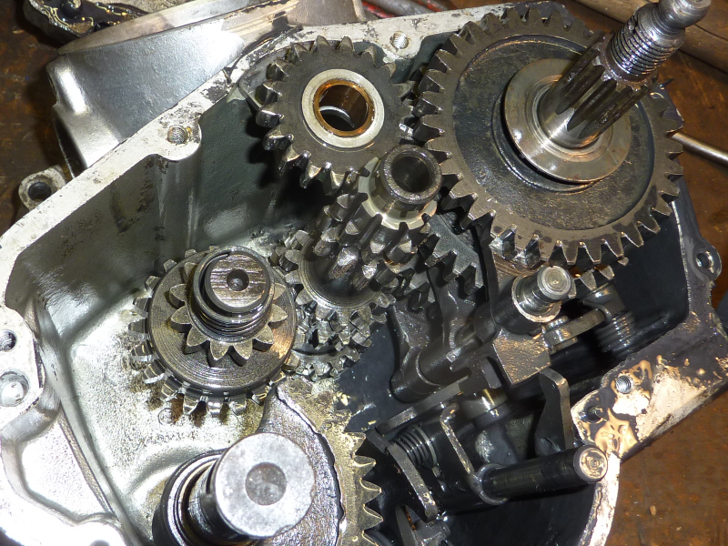 Au final, tout s'est bien passé, dans la joie et la bonne odeur, et on a trouvé ce qu'on attendait plus ou moins. des roulements russes, marqués USSR. on a rejoué de l'arrache à inertie pour extraire l'arbre secondaire, et il est sorti, ainsi que le primaire.