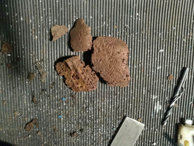 Ce qui a eu pour effet de décoller le plus gros de la rouille, un morceau de béton et également d'ouvrir une fuite derrière une des tôles ou s'accroche les grippes genoux.