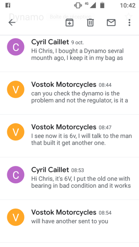 Je vous partage les échanges avec Chris de Vostok motorcycles, très réactif et très pro