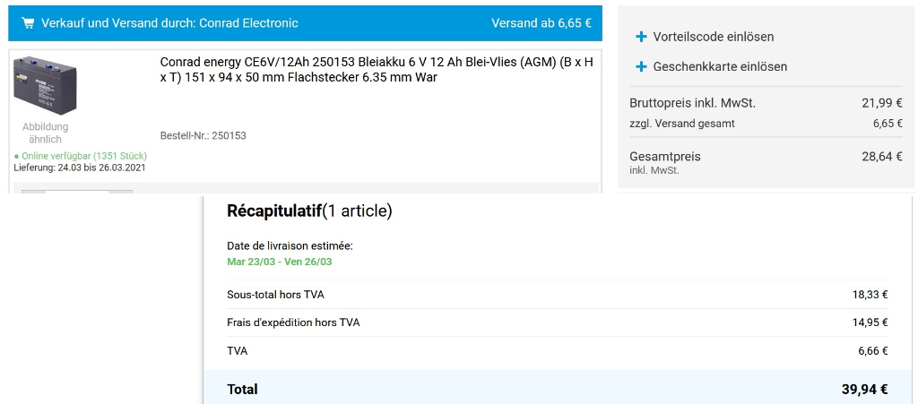 Pour le coup je parlais surtout des pièces, et si tu trouve une batterie 6V en supermarché fait moi signe...tout est fermé minimum 4 semaines pendant le confinement...et commander une batterie à 15/20€ avec 10€ de frais de ports reste pareil que de profiter de l’expédition d’une commande pour une batterie à 30€...