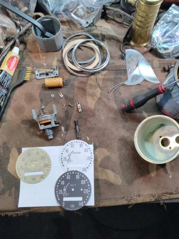 - Démontage du compteur, nettoyage de la vieille graisse, remise à zéro, et changement du verre cassé, changement du fond de compteur (par une photo récupérée sur le net, un coup de vernis pour empêcher l'humidité de le manger, j'avais fait un blanc et noir avant de me décider)