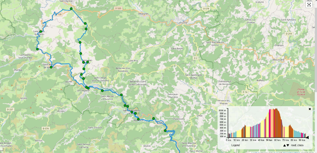 Itinéraire direction Le cheylard, St Martin de Valamas, St Julien Boutières St Agrève retour par un immense plateau et redescente sur le Cheylard avec pente à 12% version slalom !