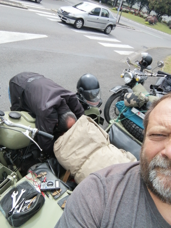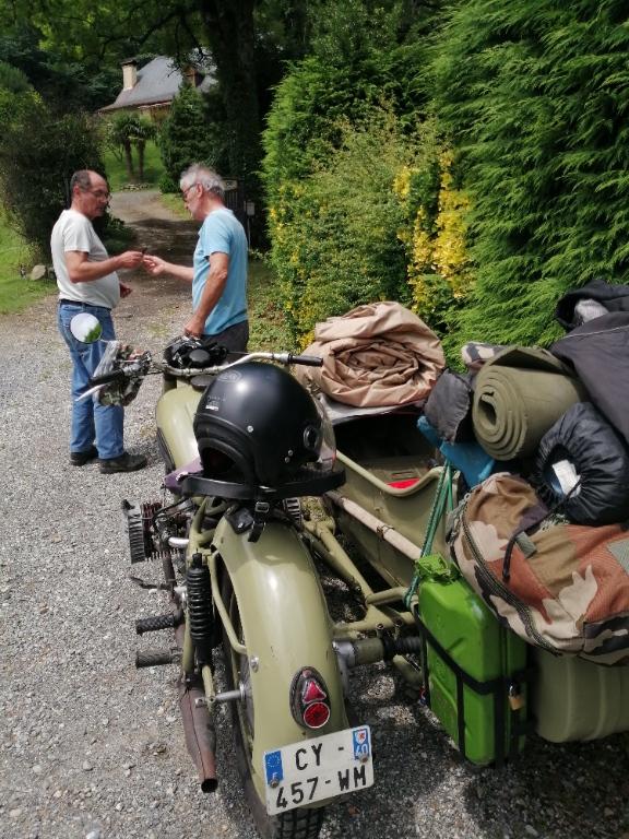 Cette journée riche en rebondissements, fut malgré tout pleine de surprises avec des rencontres de personnes plus sympas les unes que les autres. A Oloron Ste Marie, un couple de motards qui s'arrête pour admirer les "bêtes" et un mécanicien moto qui nous propose un coup de main et de l'outillage. Avant la montée au tunnel du Somport, un couple qui nous propose un verre de rouge et un café pendant que Skippy bricole. Un peu plus loin sur la route qui va vers Pau, une cycliste qui veut monter dans le panier du CJ à un rond point. Plus de peur que de mal heureusement. Et pour finir, à Pau, un mec qui s'arrête et qui nous dit en voyant la CJ : " j'ai eu la même pendant 4 ans mais j'ai du la vendre à regret !" Et tout ça sans compter les appels de phares de certains automobilistes et les sourires amusés des passants.