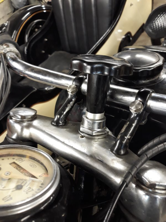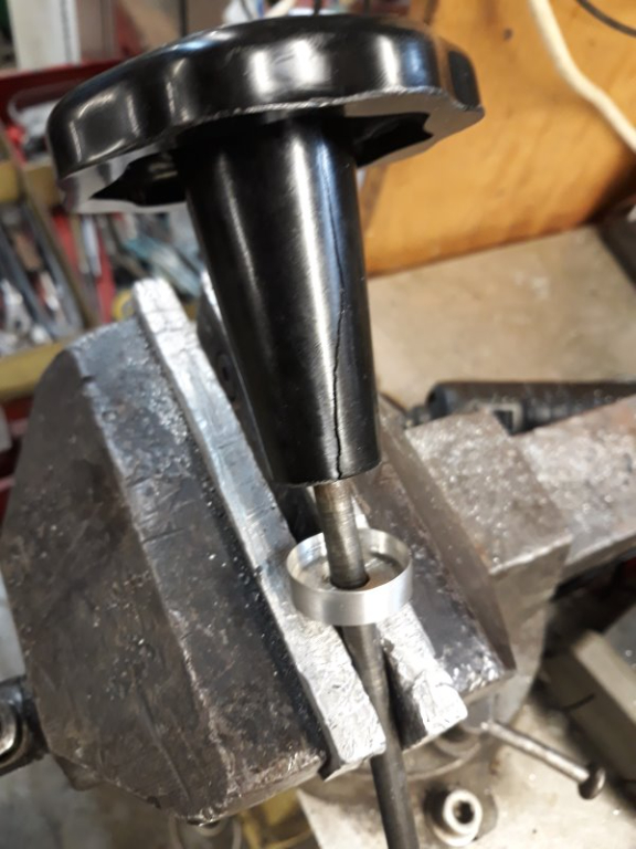 Remise en forme du frein de direction, la tête en bakélite est fendue et empêche de serrer correctement, confection d'une bague alésée conique (7°) pour éviter que la tête n'éclate au serrage . . .