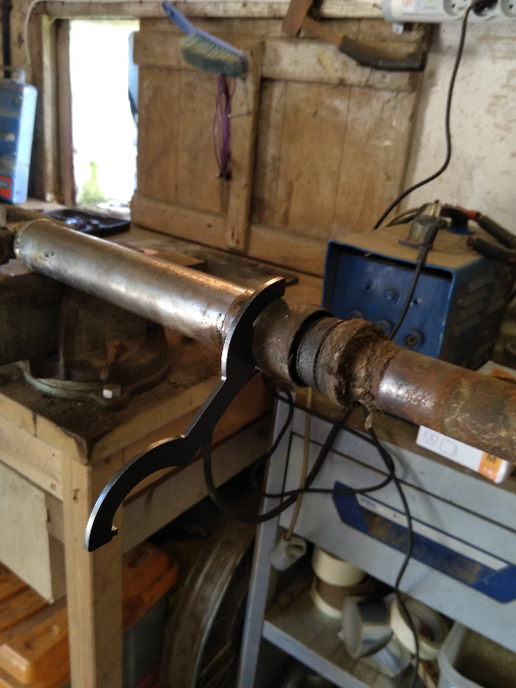 Ensuite il faut tirer sur l'écrou et l'intérieur doit venir, avec des emplacement pour mettre une clé plate (du 14 je crois). En fait il n'y a pas besoin de deux clés plates, une seule suffit pour tenir la "tige intérieure" et avec une grosse on débloque le gros nécrou du té. On doit se retrouve avec ça: