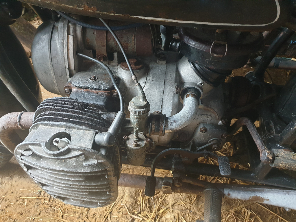 elle a l'air d'avoir été abandonnée pendant un moment (corrosion des caches soupapes et autres), et si tu dois essayer de la démarrer, mets de l'huile (un peu) dans les cylindres avant , par le trou de la bougie et fais circuler en kickant (après inspection de ce qu'il y a dans le carter d'huile, évidemment )